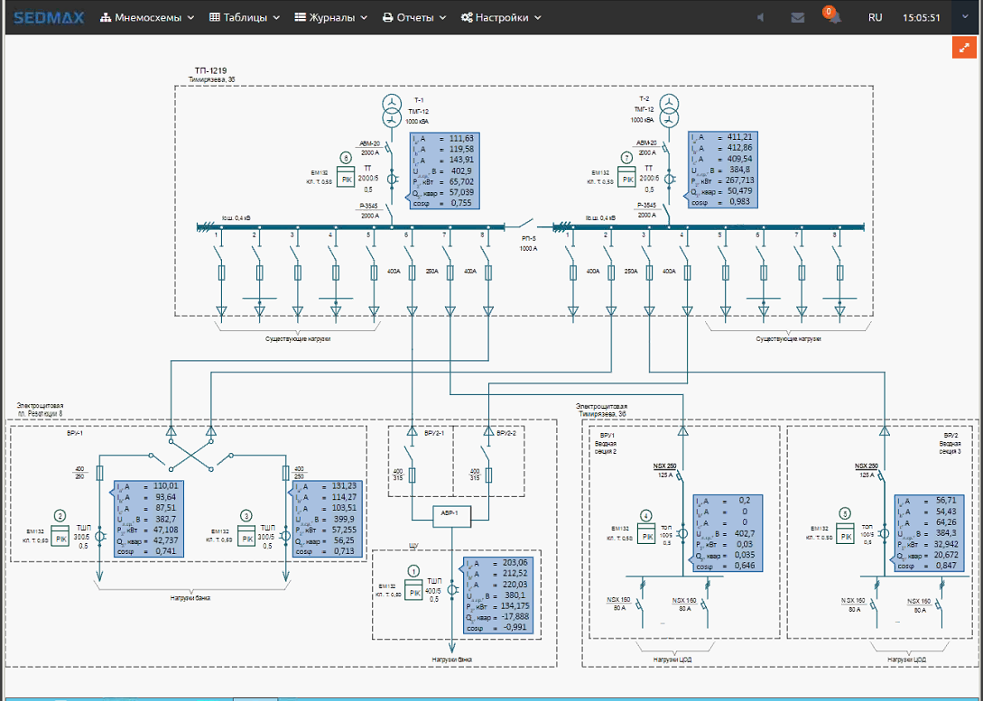 - Прозрачность и наглядность текущих параметров электросети на мнемосхеме