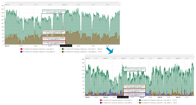 Таким образом, снижение реактивной энергии привело к снижению активной мощности на 400 кВт: