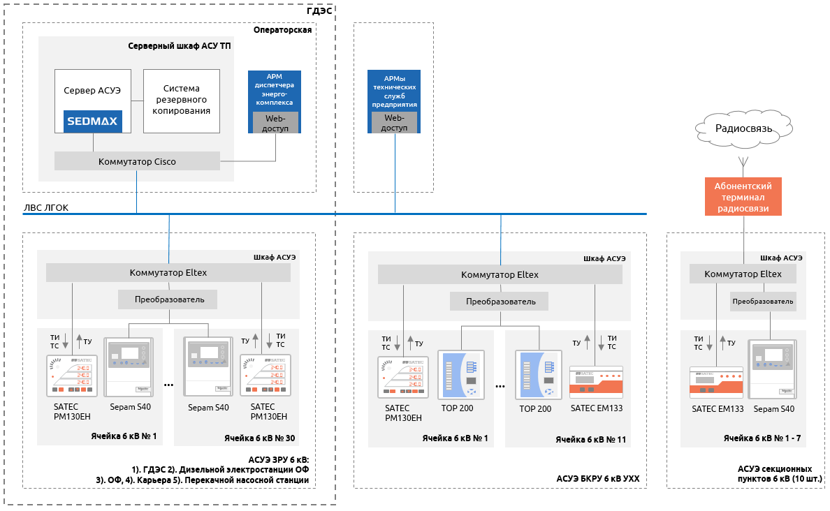 - Нижний уровень: SATEC PM130EH, EM133, Sepam, TOP-200