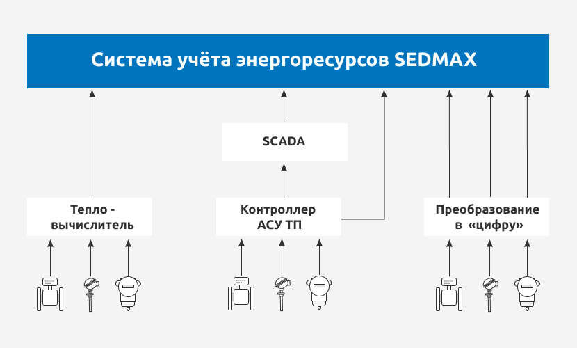 SEDMAX позволяет в рамках технического учёта энергоресурсов, помимо классической системы сбора учётных данных с тепловычислителей, расходомеров и корректоров: